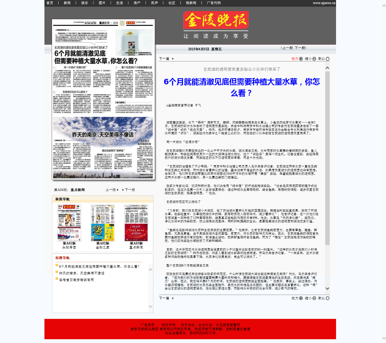 中國環保新聞網綠色南京頻道對中科水治理采取的純生態治水法表示贊揚,認為應該推廣應用,并對水體透明度、水質治理效果給與積極肯定。